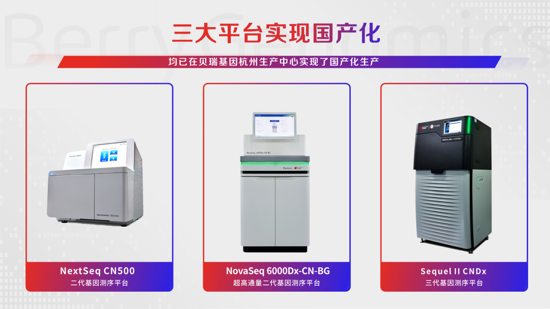 貝瑞基因目前打造了以NextSeq CN500、NovaSeq 6000Dx-CN-BG 以及 Sequel II CNDx 為代表的三大測序平臺。2019年,NextSeq CN500適用范圍變更獲得國家藥品監(jiān)督管理局批準(zhǔn),成為了適合大規(guī)模臨床基因檢測的NGS通用型平臺;Sequel II CNDx 已通過技術(shù)要求檢驗(yàn),目前處于醫(yī)療器械注冊申報中的臨床試驗(yàn)階段;NovaSeq 6000Dx-CN-BG目前處于注冊檢驗(yàn)階段。自2021年起,三大平臺均已在貝瑞基因杭州生產(chǎn)基地落地生產(chǎn),實(shí)現(xiàn)了真正意義上的國產(chǎn)化。